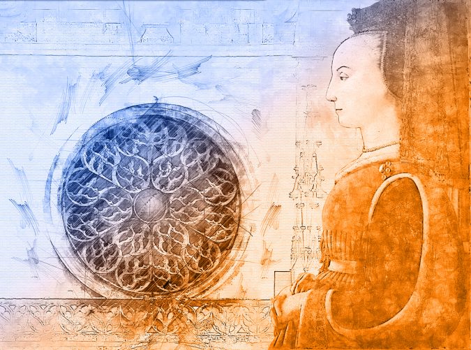 “La Dame à la rosace” est une estampe digitale qui reprend le thème du moyen-âge avec une Dame devant la rosace de la Cathédrale de Bazas.