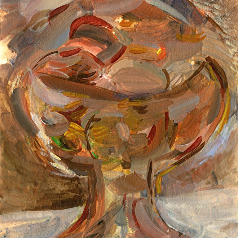 Je réalise cette pochade dans des tons associés de gris légèrement teintés en argent coloré ; et ensuite d’une gamme de tons bruns pour arriver à des pointes de rouge carmin et de terres de Sienne.