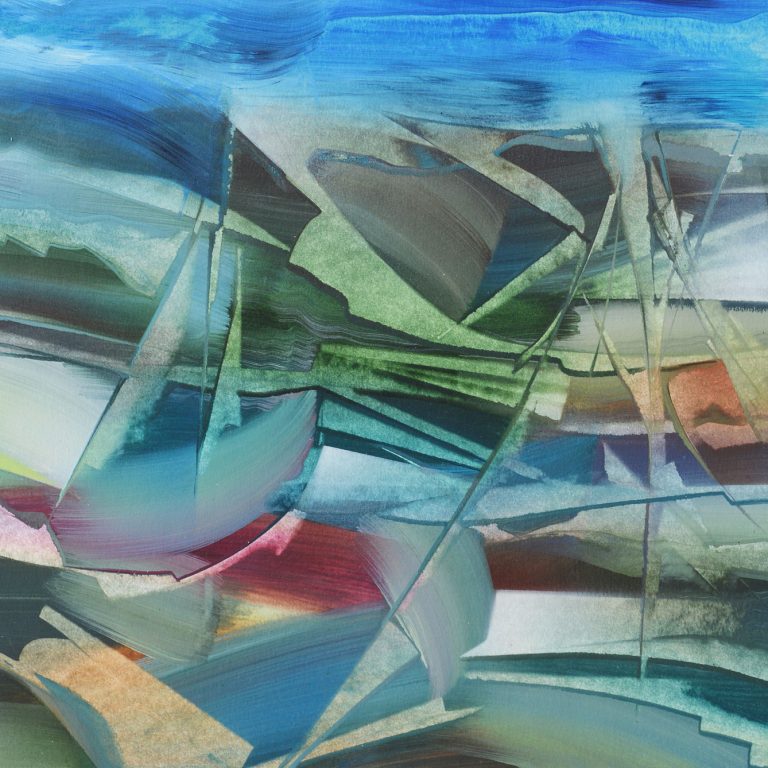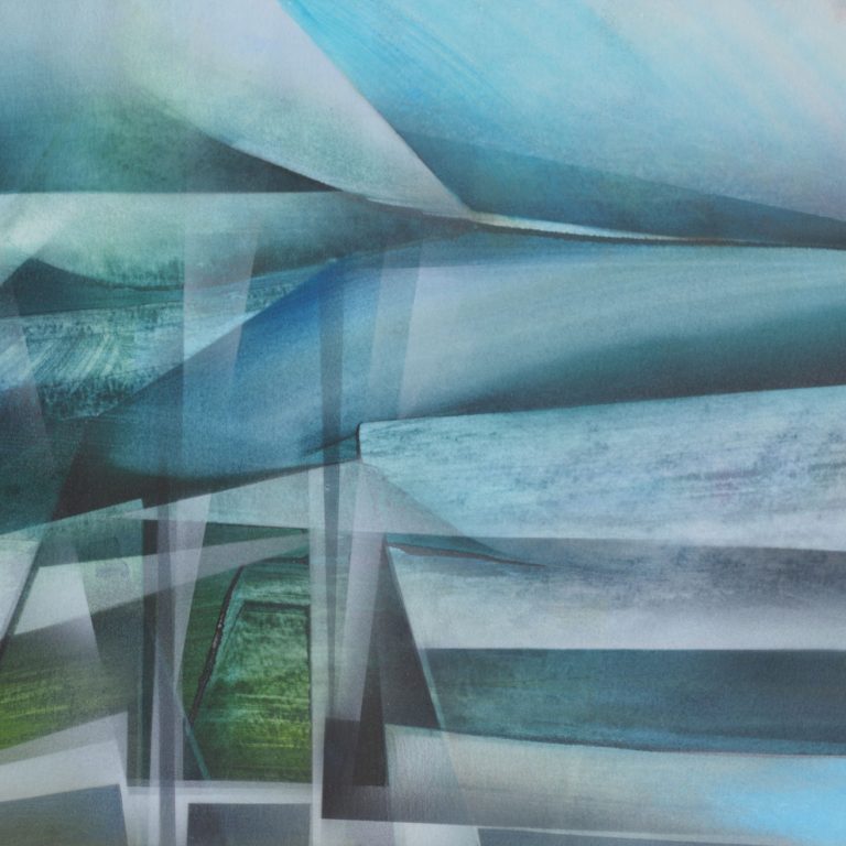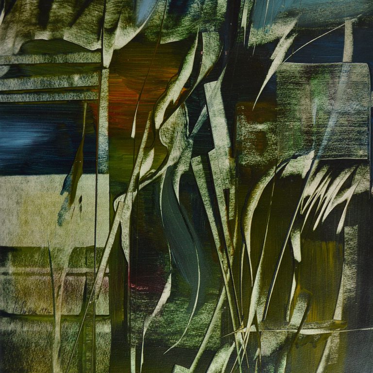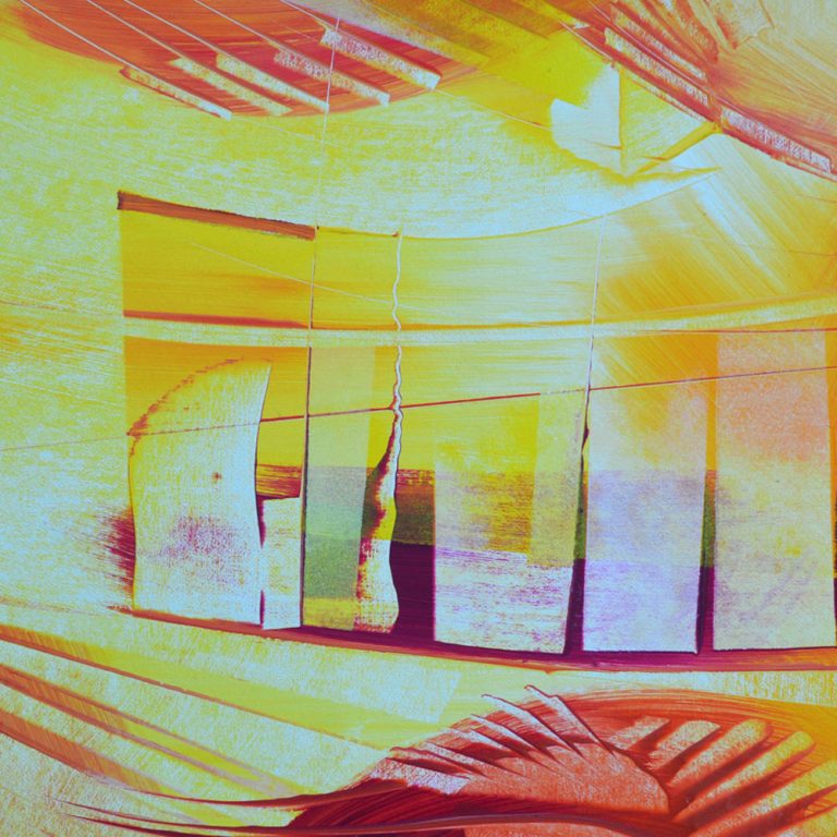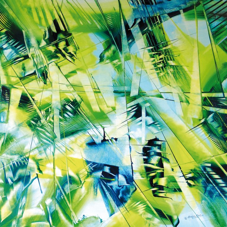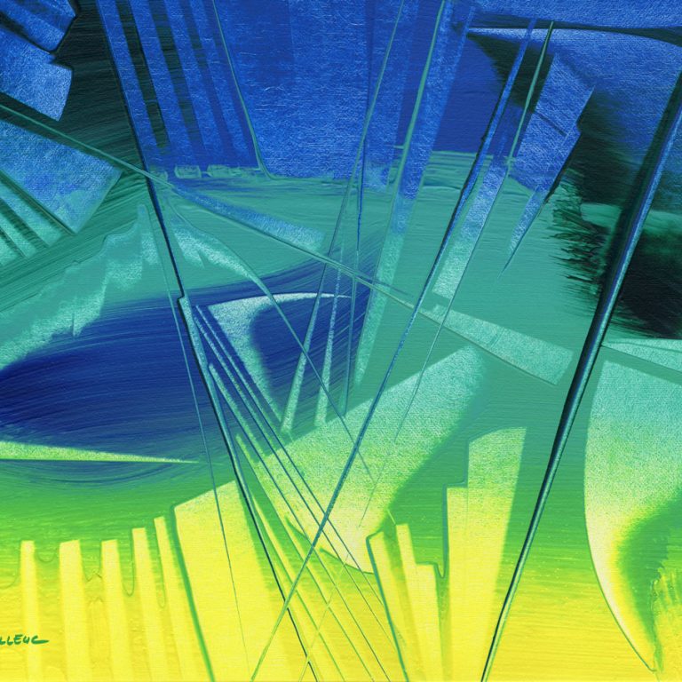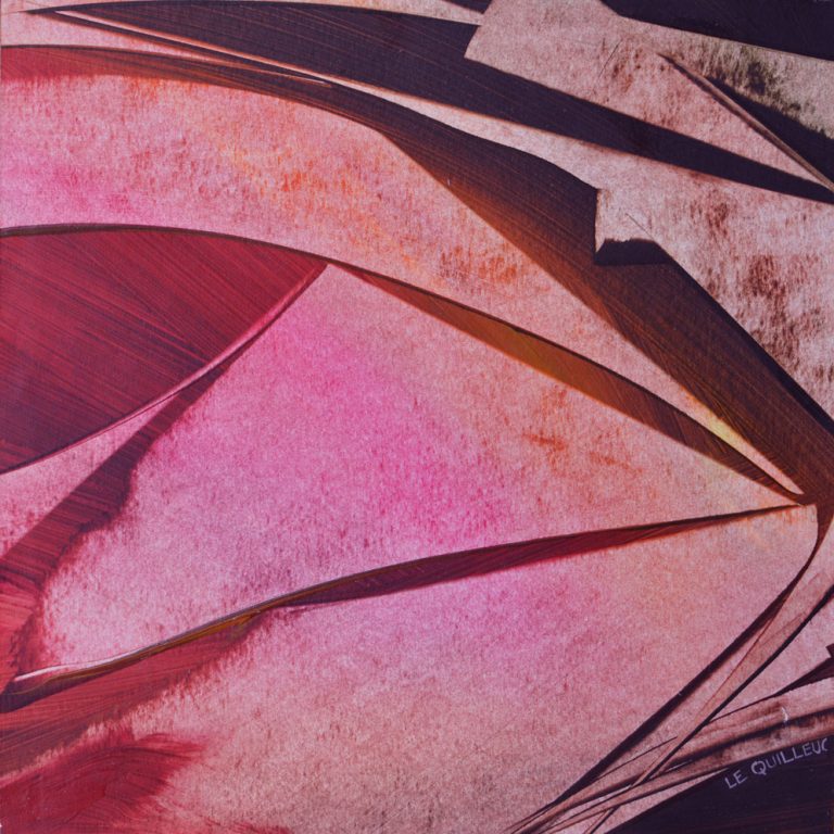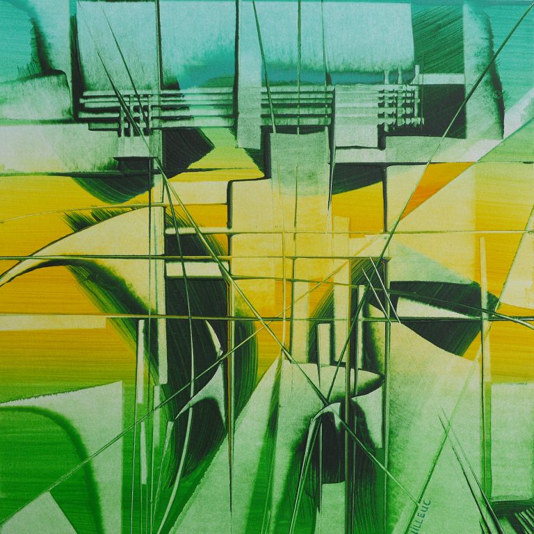 Partant d‘un “jus” léger, j’apporte touche par touche une construction “abstractisante” des volumes pour formaliser les objets virtuels de la composition.